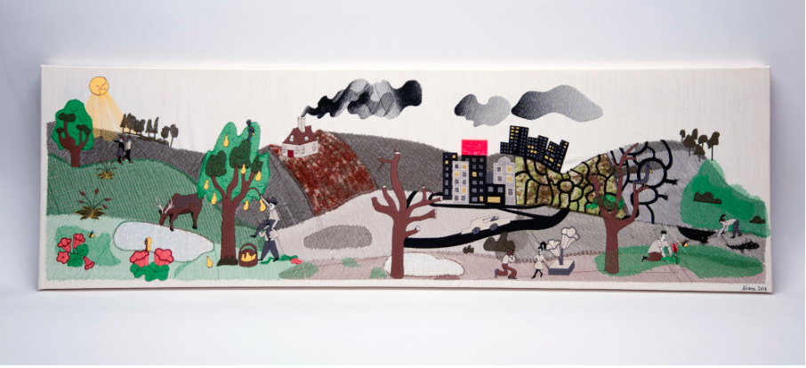The panel travels through a landscape, first showing a green valley, untouched by humans. The image moves on to show you how humans have helped themselves, altering the landscape to suit their own needs. Farmland transforms into a dystopian cityscape, trees, plants and animals have disappeared, instead there is an iron sculpture in memory of what is now extinct. But all is not lost, the narrative ends with regrowth, a new beginning. The viewer can see the heavily stitched roads being literally unpicked, as a metaphor to symbolise us trying to unpick what we have done, for a more planet-friendly future.